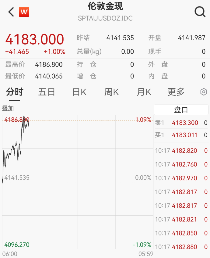10月15日上午,现货黄金价格继续走高,盘中触及4186.8美元/盎司的高位,涨超1%,再创历史新高。