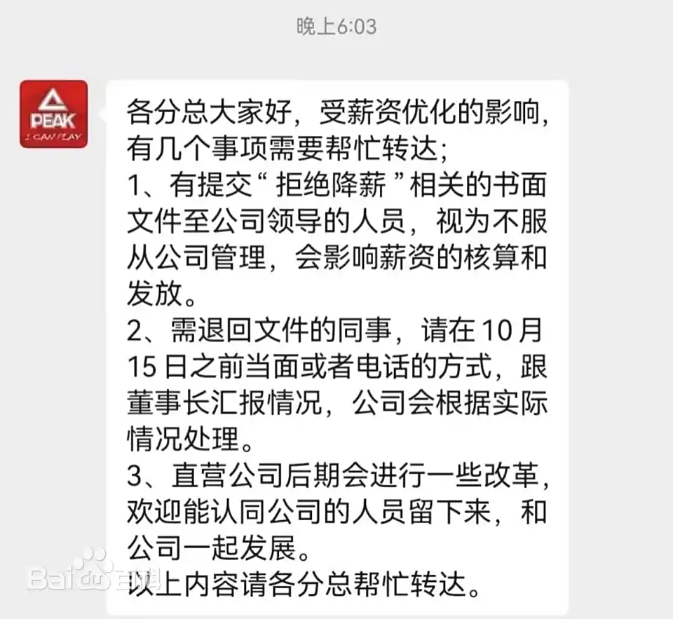 日前,有相关员工在社交媒体透露,体育用品公司匹克集团有限公司(下称“匹克集团”)10月12日对拒绝降薪的员工发出通知,要求员工须在10月14日前对薪酬问题、不服从公司相关的管理进行反思、说明并提交检讨,否则将自2025年9月起暂时停发薪酬,此为特殊时期的临时性措施。