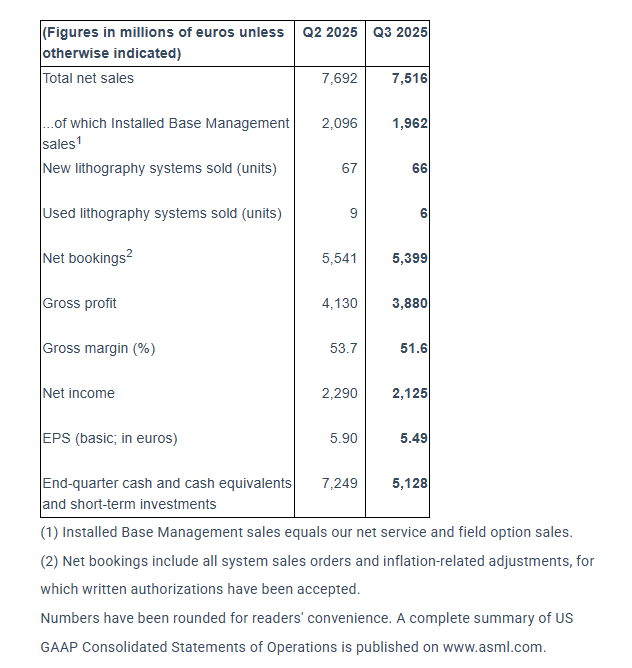 10月15日,阿斯麦发布2025年第三季度财报:第三季度净销售额为75亿欧元,毛利率51.6%,净利润21亿欧元;第三季度净新增订单54亿欧元,其中36亿欧元为极紫外光刻系统。