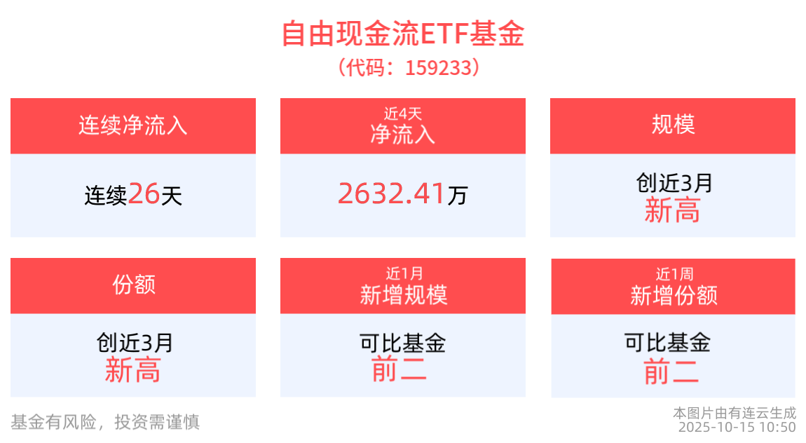 规模方面,自由现金流ETF基金最新规模达2.81亿元,创近3月新高。份额方面,自由现金流ETF基金最新份额达2.46亿份,创近3月新高。