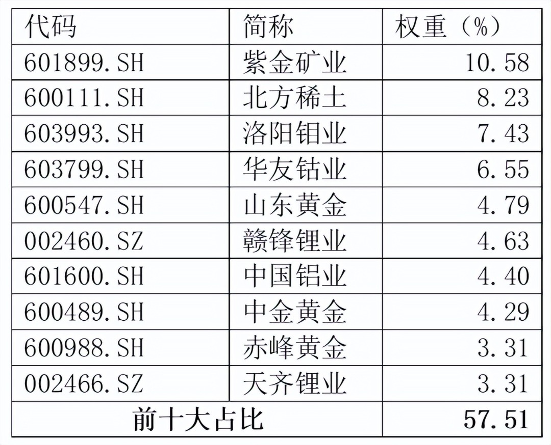 从前十大成分股来看,清一色“家里有矿”资源龙头,前十大占比合计超57%,集中度相对也更高,锐度十足。