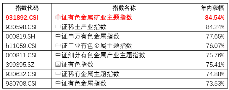在众多布局有色金属的ETF产品中,矿业ETF(561330) 今年以来的涨幅显著高于普通有色金属类ETF。以矿业ETF跟踪的中证有色金属矿业主题指数为例,年内涨幅不仅显著超越大部分有色指数,甚至也超过了稀土指数。