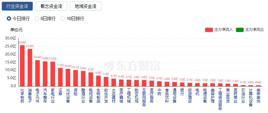 行业资金方面,截至收盘,化学制药、消费电子、电子元件等净流入排名靠前,其中化学制药净流入25.80亿。