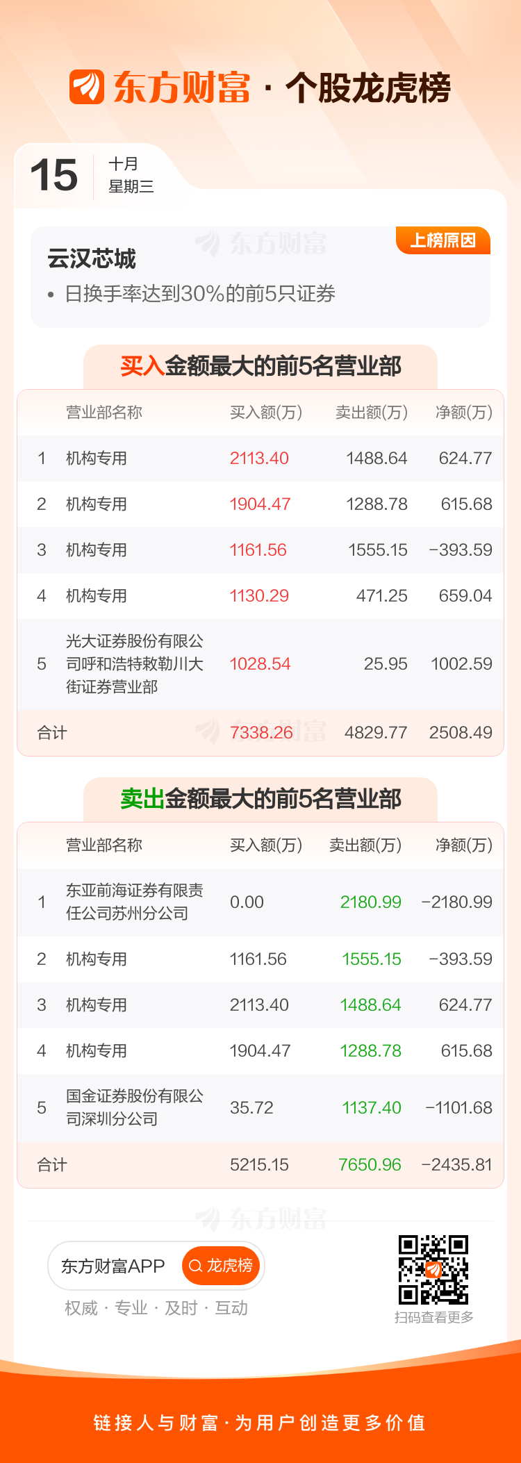 交易所2025年10月15日公布的交易公开信息显示,云汉芯城因成为日换手率达到30%的前5只证券上榜。云汉芯城当日收报127.23元,涨跌幅-7.47%,偏离值41.40%,换手率41.40%,成交额7.31亿。