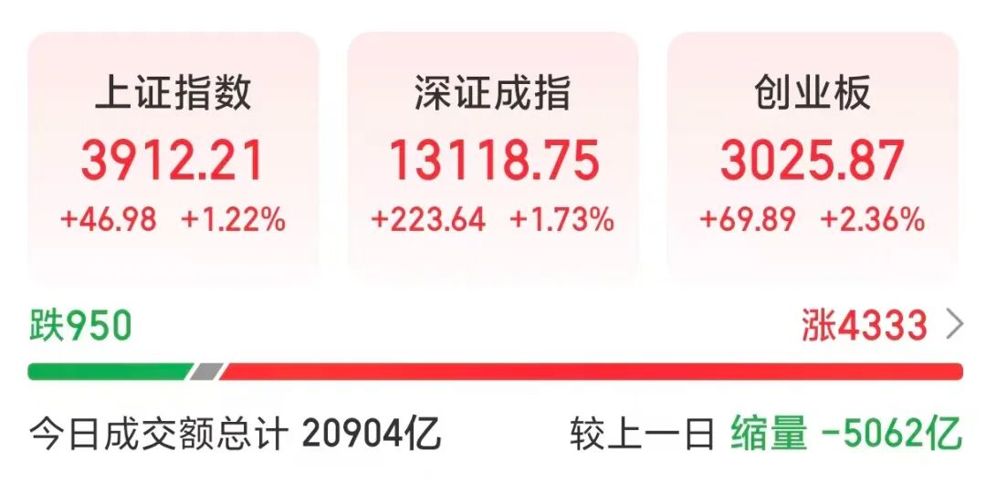 今日,A股三大指数集体上涨,沪指涨超1%,重回3900点。市场超4300只个股上涨。