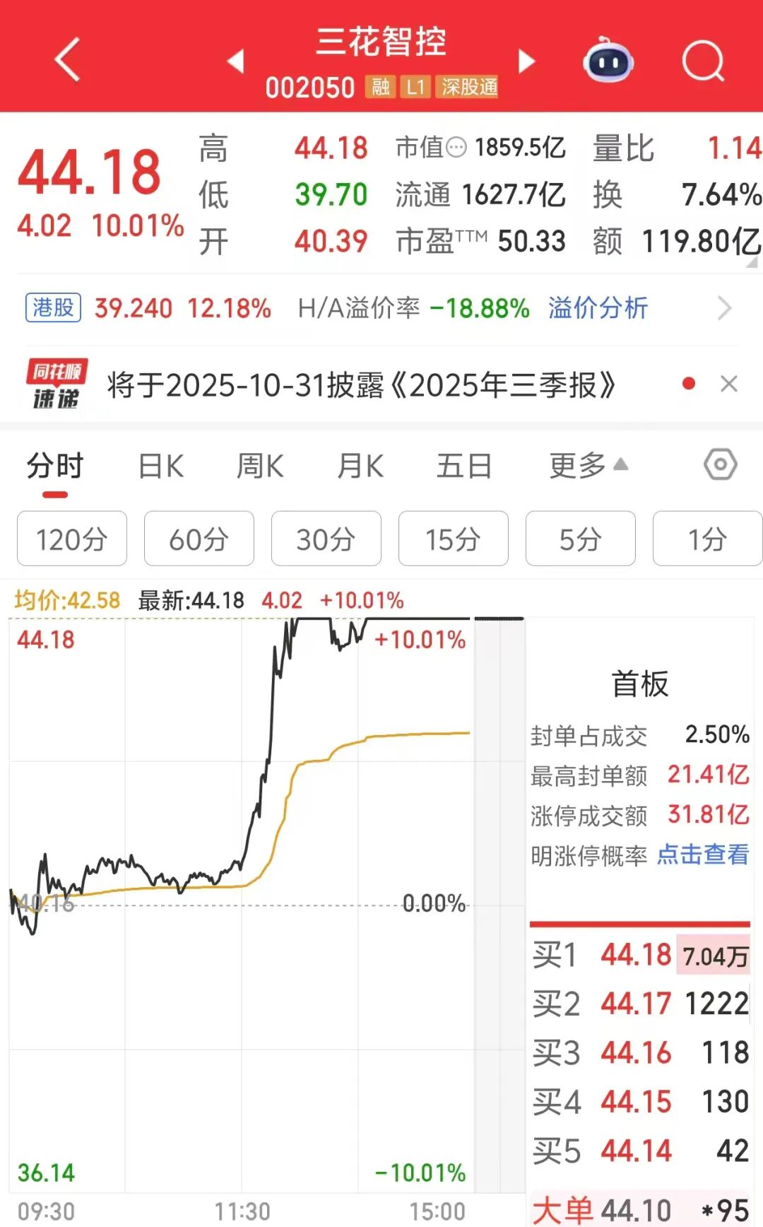 三花智控A、H股今日双双走强。三花智控A股午后开盘直线涨停,总市值为1859.5亿元;三花智控H股盘中最高涨近14%。三花智控位居万得A股人气榜第一。