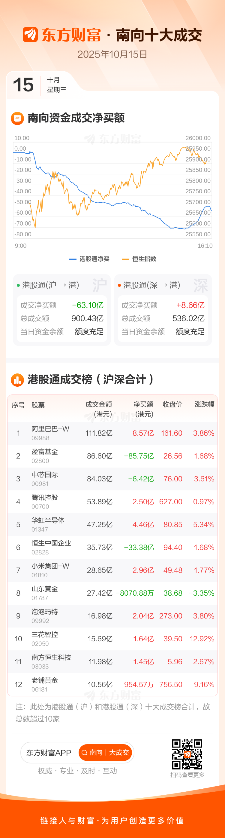 恒生指数10月15日涨1.84%,收报25910.6点。南向资金今日净卖出港股54.43亿港元。南向资金今日成交额1436.45亿港元,港股大市成交3158.13亿港元。