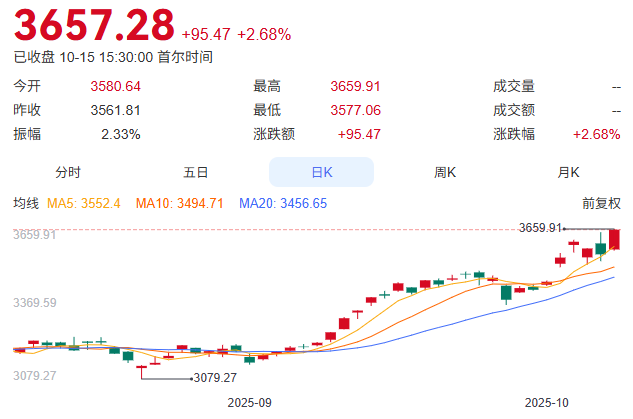 当地时间10月15日,KOSPI指数报收3657.28点,较前一交易日上升95.47点,涨幅2.68%,续创历史新高。