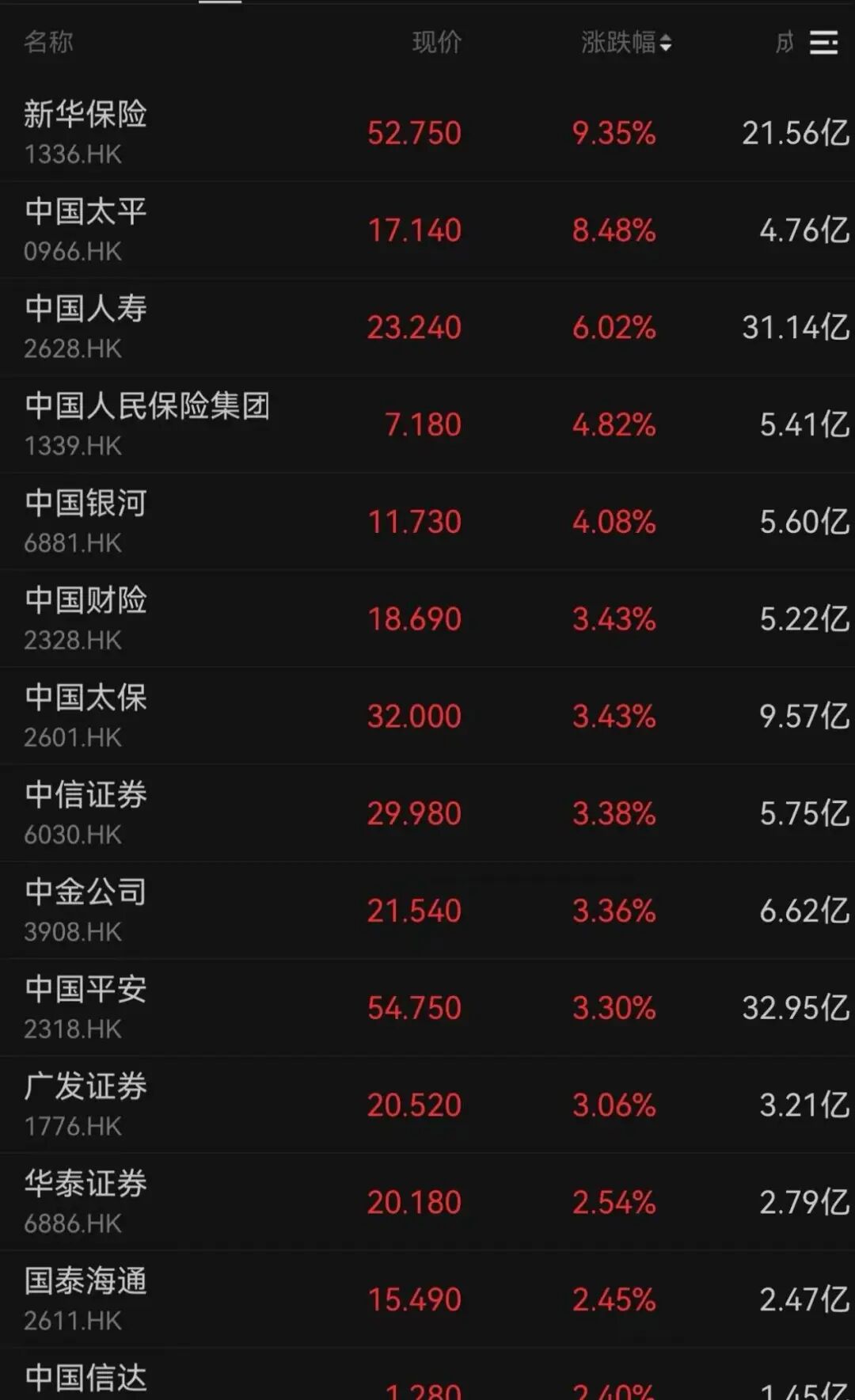 券商、保险、银行板块全面上涨。新华保险、中国太平、中国人寿分别上涨9.35%、8.48%、6.02%。中信证券、中金公司和广发证券涨超3%。