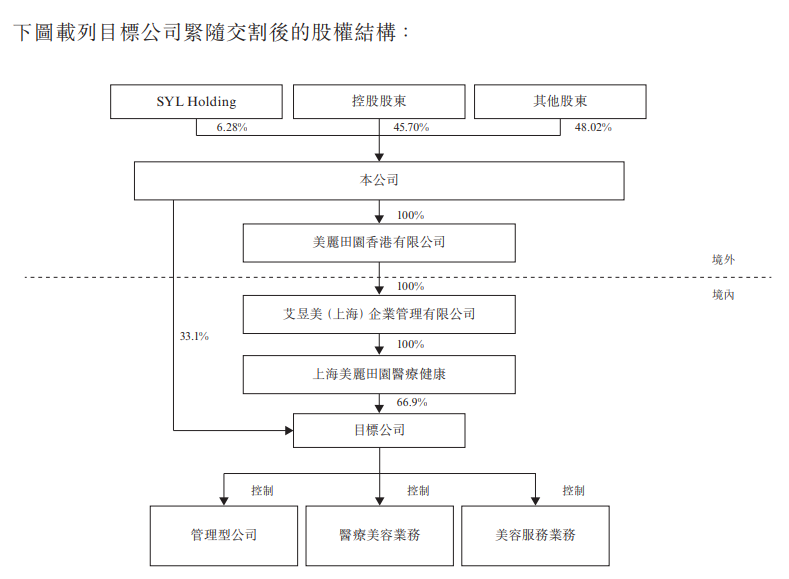 交割前,目标公司分别由SYL Holding持有74%权益及上海安妍持有26%权益。交割后,目标公司将成为美丽田园医疗健康间接全资附属公司,其业绩、资产及负债将并入上市公司账目。