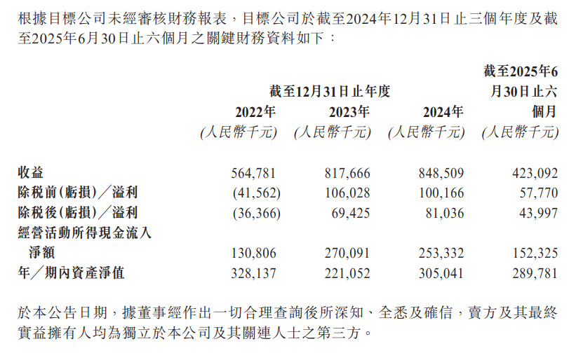 另据目标公司未经审核财务报表,2022年至2024年及今年上半年,目标公司的收益分别为5.65亿元、8.18亿元、8.49亿元、4.23亿元;资产净值分别为3.28亿元、2.21亿元、3.05亿元、2.9亿元。