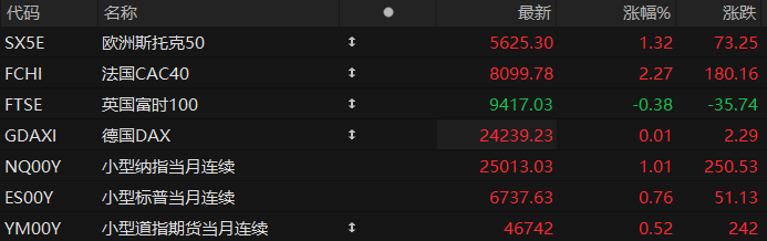 周三盘前,美股三大股指期货齐涨,欧洲主要指数多数上涨。截至发稿,纳斯达克100指数期货涨1.01%,标普500指数期货涨0.76%,道指期货涨0.52%。