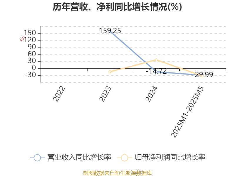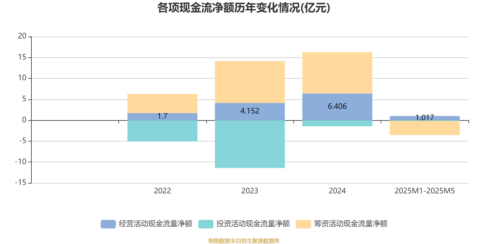 2025年1月至5月,公司经营活动现金流净额为1.02亿元,同比下降49.32%;筹资活动现金流净额-3.39亿元,同比减少4.55亿元;投资活动现金流净额-1505.7万元,上年同期为-1.02亿元。