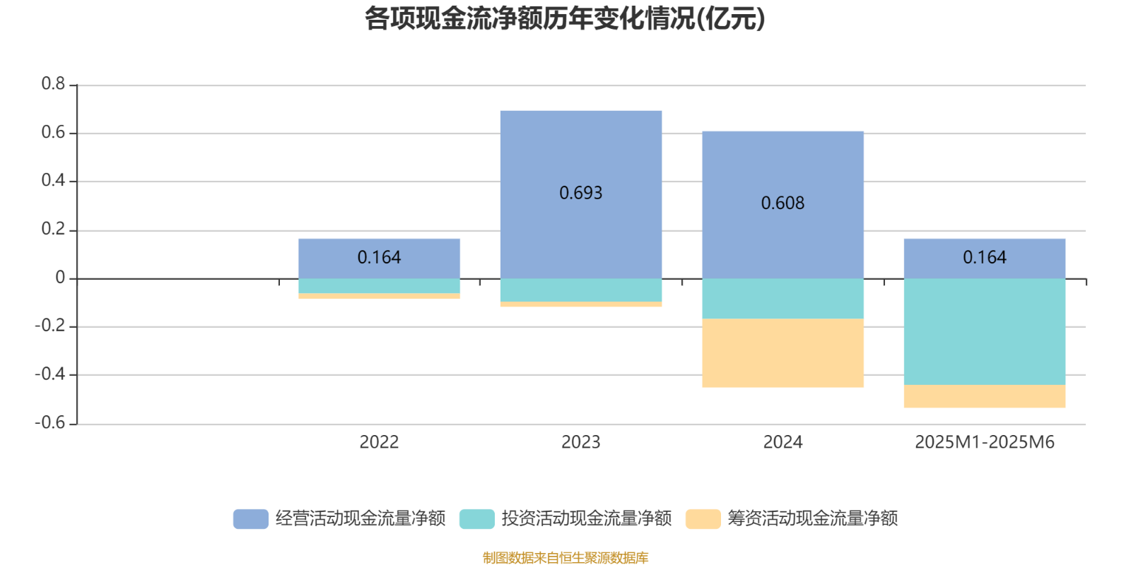 2025年1月至6月,公司经营活动现金流净额为1643.8万元,同比下降34.5%;筹资活动现金流净额-951.7万元,同比增加2387.1万元;投资活动现金流净额-4386.9万元,上年同期为-5344.1万元。