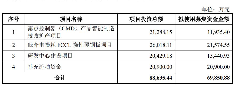 根据方案,本次定增发行数量不超过2730万股,募资不超过6.99亿元,扣除发行费用后将投入四大项目,其中1.19亿元用于露点控制器(CMD)产品智能制造技改扩产项目,2.16亿元用于低介电损耗FCCL挠性覆铜板项目,1.54亿元用于研发中心建设项目,2.09亿元用于补充流动资金。