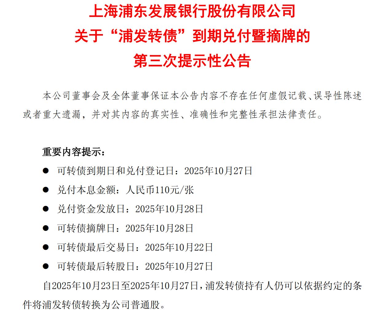 银行可转债只有成功转股才能计入核心一级资本,否则发行方需兑付到期本息。9月中旬起,浦发银行陆续发布提示性公告称,将以可转债票面面值的110%(含最后一期年度利息)的价格向投资者赎回全部未转股的可转债。