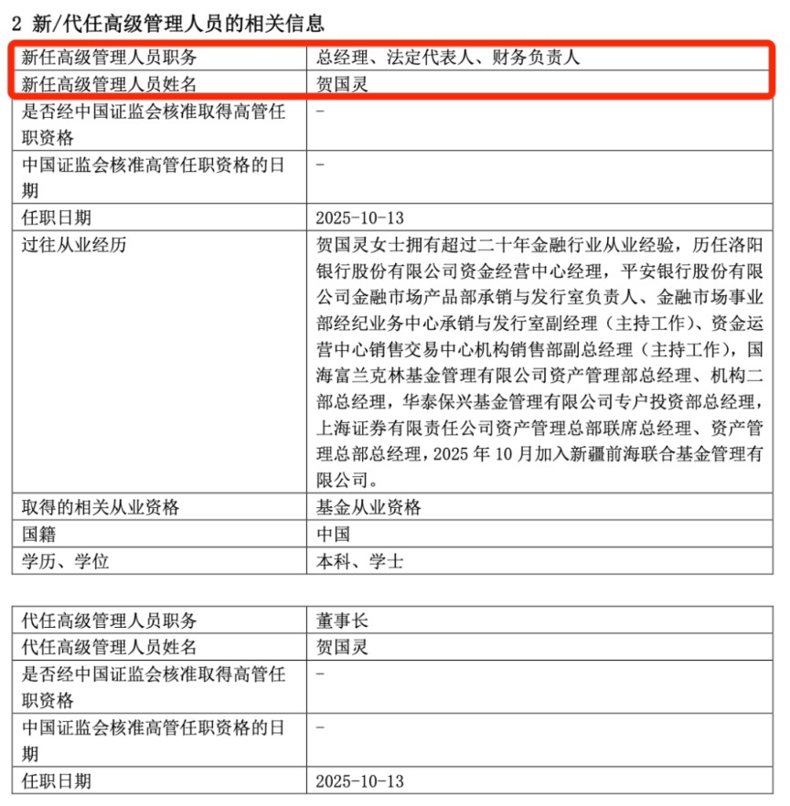 与此同时,新疆前海联合基金也对外官宣新一任领导。贺国灵出任公司总经理、法定代表人、财务负责人,同时代任公司董事长。