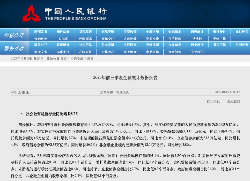 中国人民银行10月15日发布的前三季度金融统计数据报告显示,初步统计,今年前三季度,社会融资规模增量累计突破30万亿元,达到30.09万亿元,比上年同期多4.42万亿元;人民币贷款增加14.75万亿元,人民币存款增加22.71万亿元。