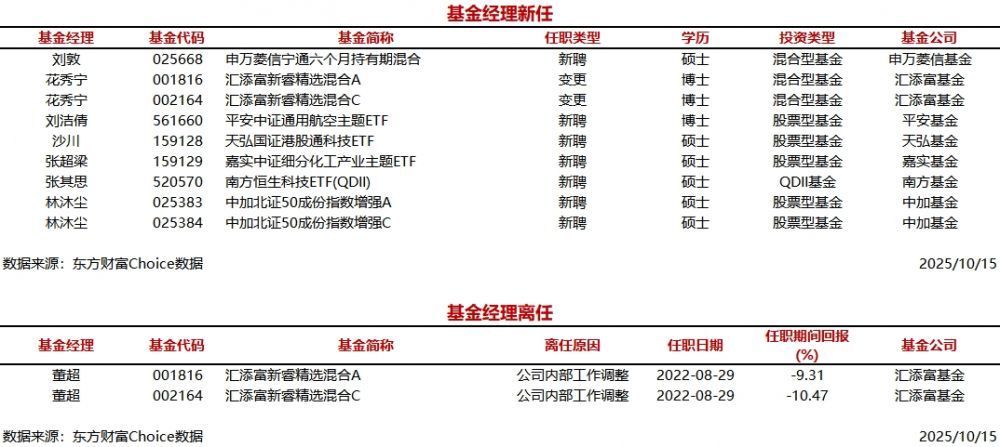 每经AI快讯,据东方财富Choice数据统计,今日新聘基金经理7人,涉及9只基金(A/C类分开计算),主要来自南方基金、汇添富基金等公司。另外,今日有1位基金经理离任。