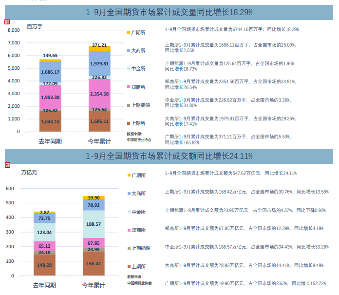 从前三季度来看,今年1月至9月全国期货市场累计成交量为67.44亿手,累计成交额为547.62万亿元,同比分别增长18.29%和24.11%。