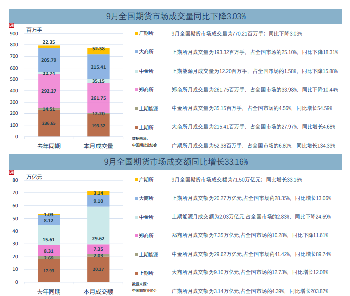 中国期货业协会最新统计资料表明,9月全国期货市场成交量为7.7亿手,成交额为71.5万亿元,同比分别下降3.03%和增长33.16%。9月末全国期货市场持仓量为4503.97万手,环比下滑8.25%,同比增长20%。