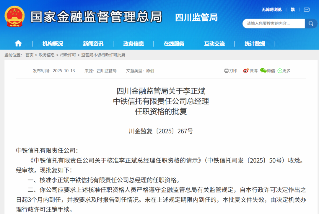 中铁信托有限责任公司(下称“中铁信托”)总经理落定。国家金融监管总局四川监管局近日公布相关批复,核准李正斌中铁信托总经理的任职资格。