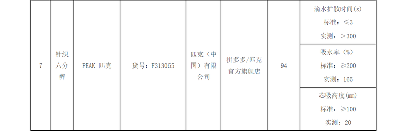 2022年8月,在对部分吸湿速干类服装、防晒类服装、冰袖及帽子等86个品牌样品开展比较试验后,北京市消费者协会发布“吸湿速干防紫外线服装比较试验结果”。其中,PEAK匹克一款针织六分裤不符合标准,问题指向滴水扩散时间、吸水率以及芯吸高度。