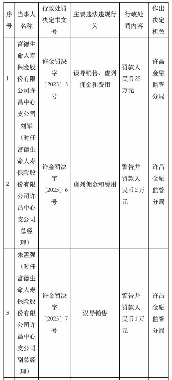 国家金融监督管理总局许昌监管分局10月15日披露的行政处罚信息公示表显示,富德生命人寿保险股份有限公司许昌中心支公司被罚款25万元,主要违法违规行为是,误导销售、虚列佣金和费用。