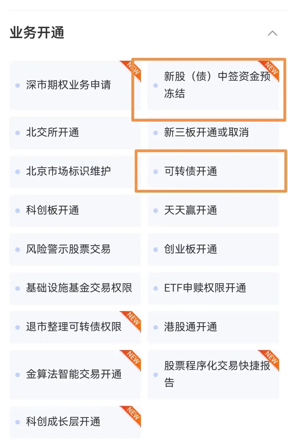 第二步,在“业务开通”中,办理“可转债开通”和“新股(债)中签资金预冻结”业务。