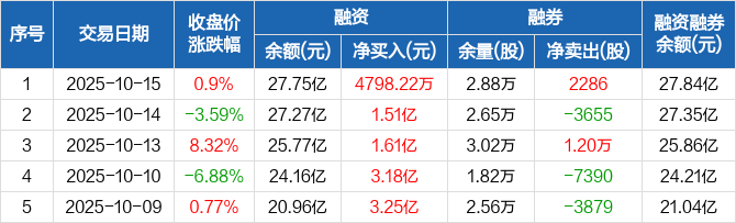 融资方面,当日融资买入5.25亿元,融资偿还4.77亿元,融资净买入4798.22万元,连续5日净买入累计10.02亿元。融券方面,融券卖出6199股,融券偿还3913股,融券余量2.88万股,融券余额900.93万元。融资融券余额合计27.84亿元。