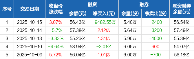 融资方面,当日融资买入9.36亿元,融资偿还10.31亿元,融资净偿还9482.55万元。融券方面,融券卖出1.12万股,融券偿还1.36万股,融券余量5.4万股,融券余额1090.85万元。融资融券余额合计56.54亿元。