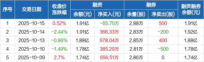 融资方面,当日融资买入355.8万元,融资偿还421.5万元,融资净偿还65.7万元。融券方面,融券卖出600股,融券偿还100股,融券余量2.88万股,融券余额55.58万元。融资融券余额合计1.91亿元。