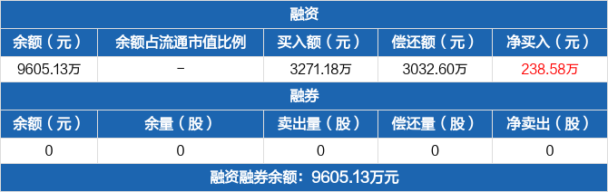 融资方面,当日融资买入3271.18万元,融资偿还3032.6万元,融资净买入238.58万元,连续3日净买入累计1318.28万元。融券方面,融券卖出0份,融券偿还0份,融券余量0份,融券余额0元。融资融券余额合计9605.13万元。