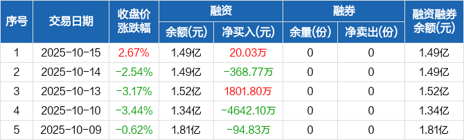 融资方面,当日融资买入7325.7万元,融资偿还7305.67万元,融资净买入20.03万元。融券方面,融券卖出0份,融券偿还0份,融券余量0份,融券余额0元。融资融券余额合计1.49亿元。