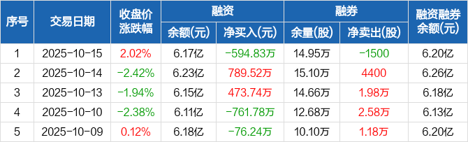 融资方面,当日融资买入1350.06万元,融资偿还1944.89万元,融资净偿还594.83万元。融券方面,融券卖出0股,融券偿还1500股,融券余量14.95万股,融券余额233.67万元。融资融券余额合计6.2亿元。