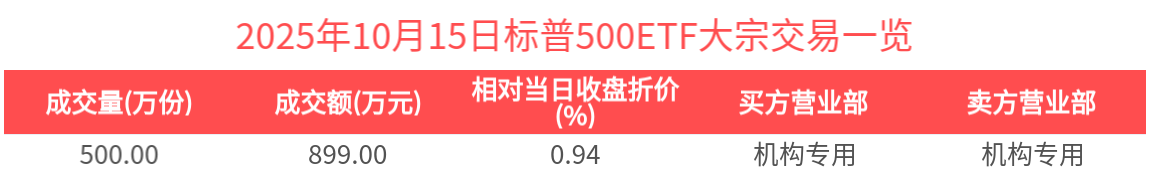ETF大宗榜 | 标普500ETF(159612):获大宗交易折价卖出899.00万元,居可比基金首位-20251015