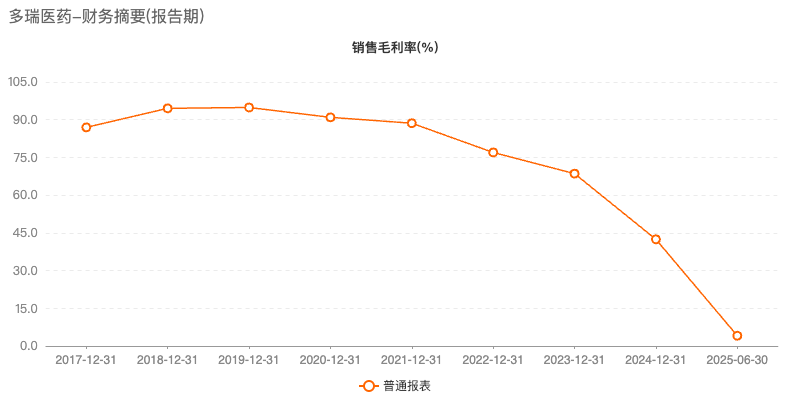 更值得注意的是公司毛利率显著下滑:从2023年的68.55%大幅降至2025年上半年的4.07%,期间下降64.48个百分点,已不足峰值94.86%的零头,这一数据意味着多瑞医药的核心盈利能力基本丧失。