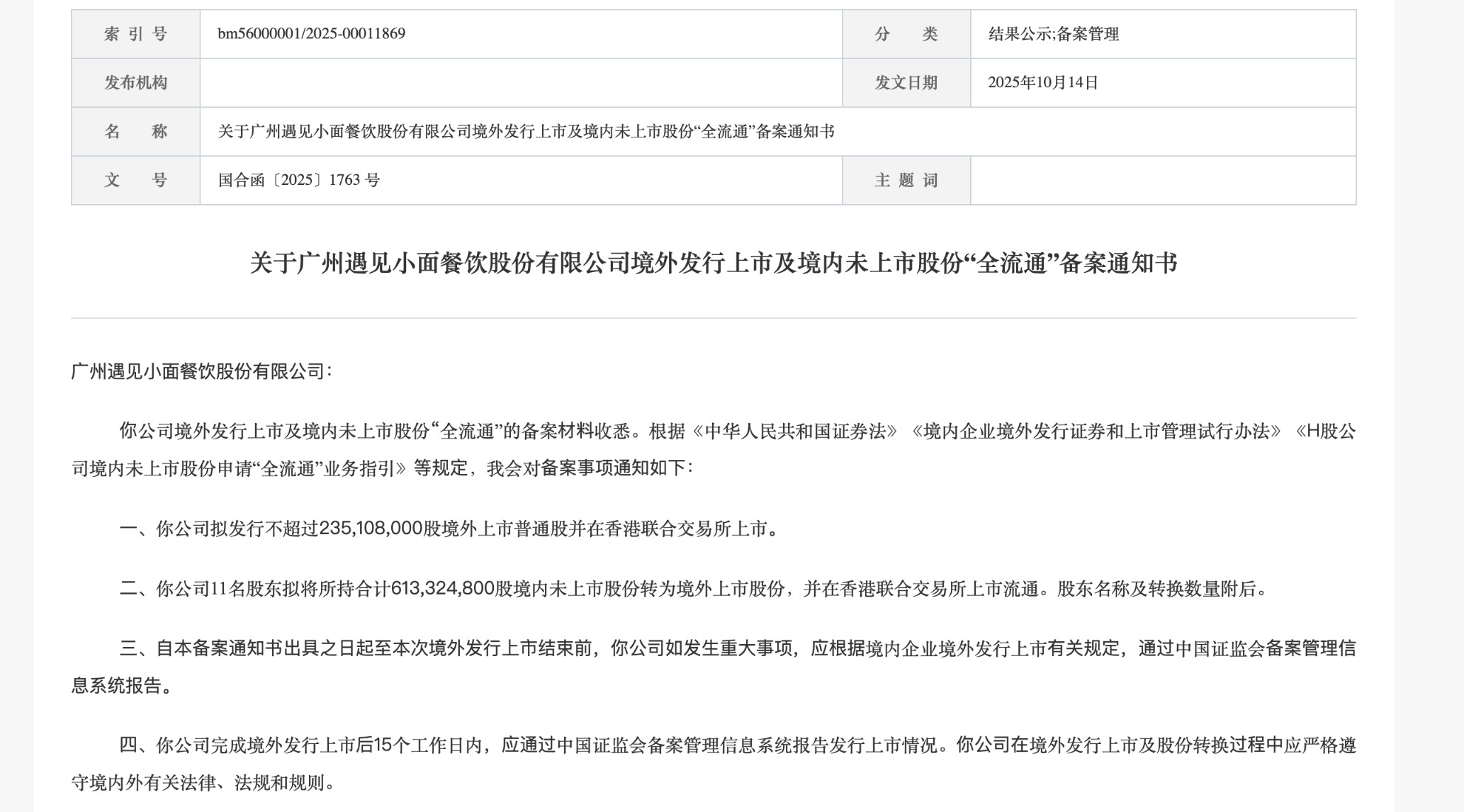 根据公告,遇见小面的境外发行上市及境内未上市股份“全流通”的备案材料收悉。