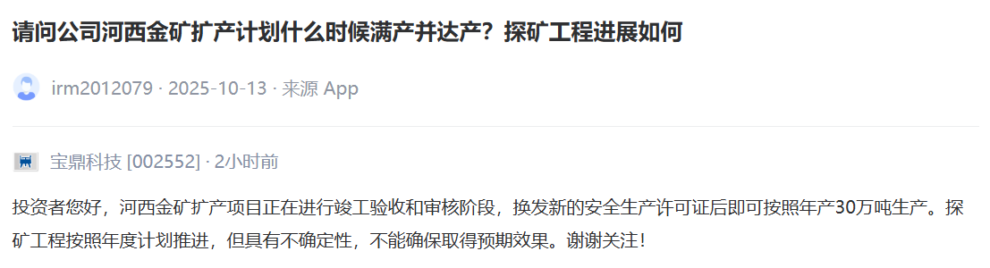 宝鼎科技:河西金矿扩产项目正在进行竣工验收和审核阶段