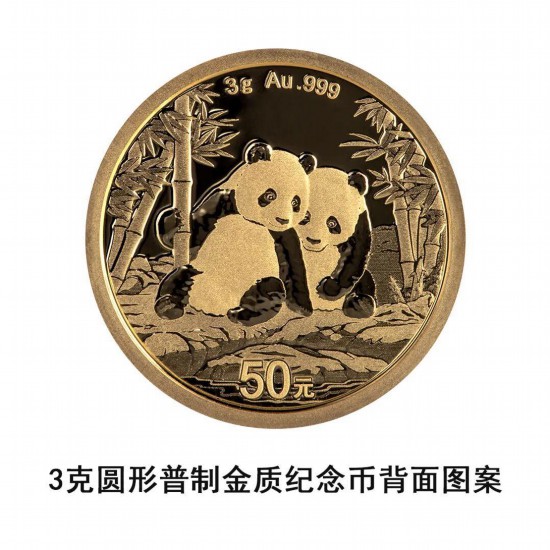 3克圆形金质纪念币为普制币,含纯金3克,直径18毫米,面额50元,成色99.9%,最大发行量500000枚。