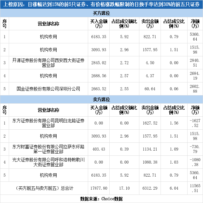 多主力现身龙虎榜,云汉芯城涨停(10-16)
