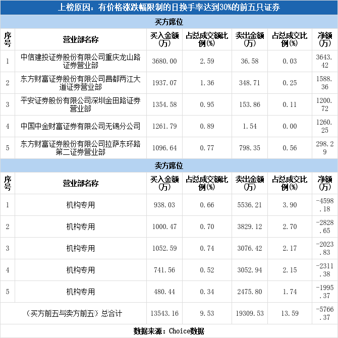 龙虎榜数据显示,今日共5个机构席位出现在龙虎榜单上,分别位列卖一、卖二、卖三、卖四、卖五,合计净卖出1.38亿元,占龙虎榜净卖额的238.58%。