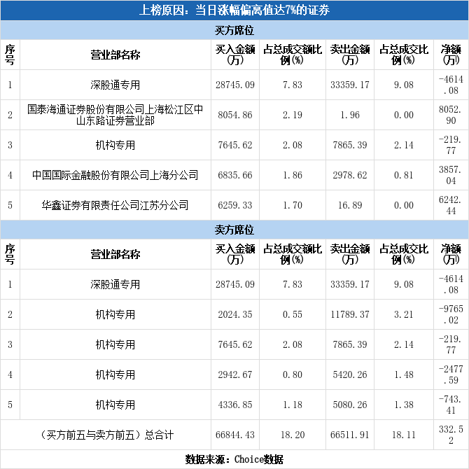 今日龙虎榜单上出现了深股通的身影,占据了买一、卖一的位置,净卖出4614.08万元,占当日成交总额的1.26%。