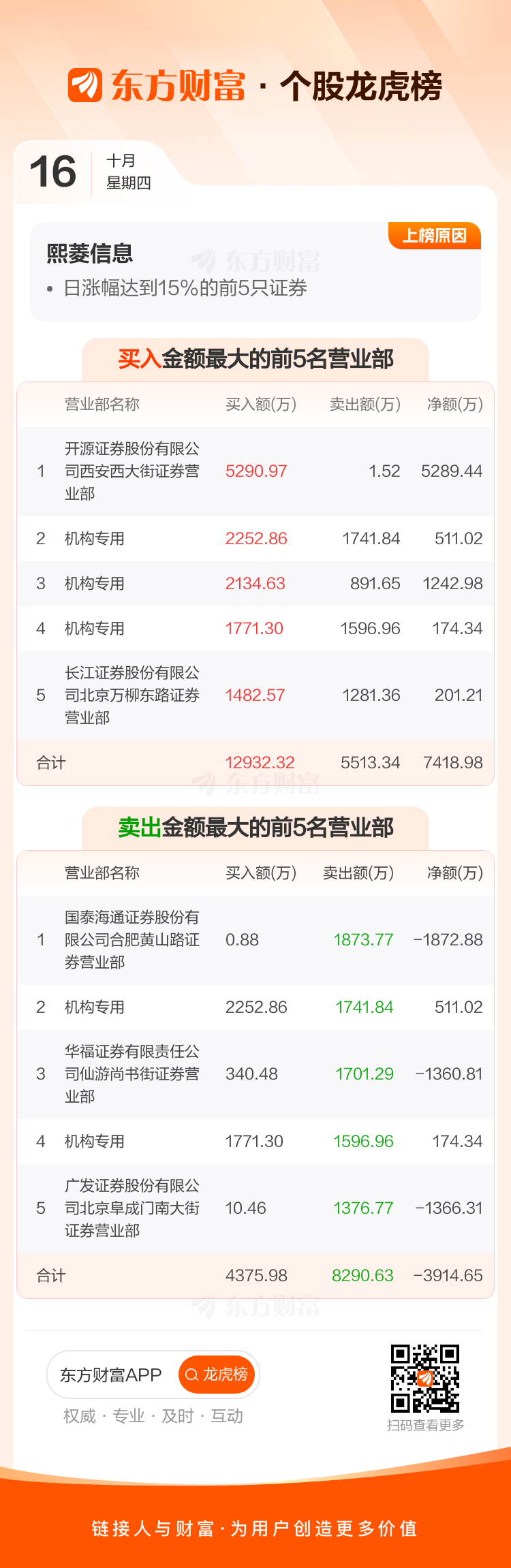 交易所2025年10月16日公布的交易公开信息显示,熙菱信息因成为日涨幅达到15%的前5只证券、连续三个交易日内,涨幅偏离值累计达到30%的证券上榜。熙菱信息当日收报25.5元,涨跌幅20.00%,偏离值20.00%,换手率17.94%,成交额7.40亿。异常期间10月14日至10月16日,期间涨幅32.47%,累计偏离值34.02%,区间成交额13.46亿。