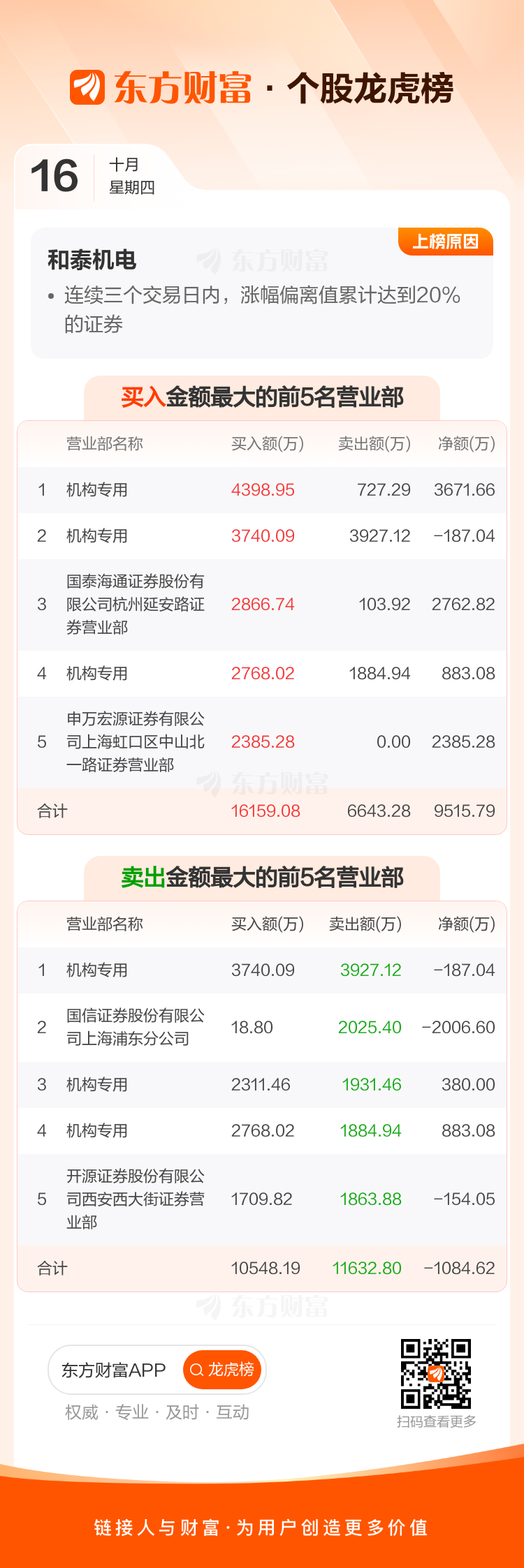 交易所2025年10月16日公布的交易公开信息显示,和泰机电因成为日换手率达到20%的前5只证券、连续三个交易日内,涨幅偏离值累计达到20%的证券上榜。和泰机电当日收报56.81元,涨跌幅2.40%,偏离值26.57%,换手率26.57%,成交额3.16亿。异常期间10月14日至10月16日,期间涨幅19.73%,累计偏离值20.66%,区间成交额8.99亿。