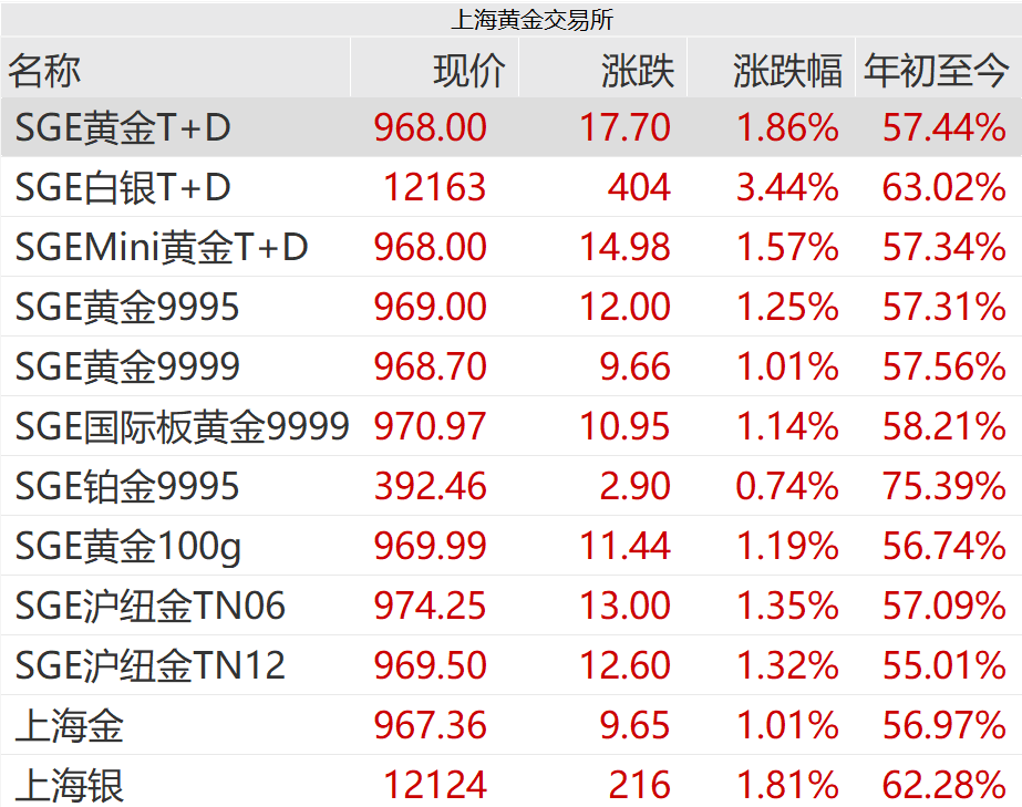 上金所旗下黄金、白银、铂金等品种均有明显涨幅。