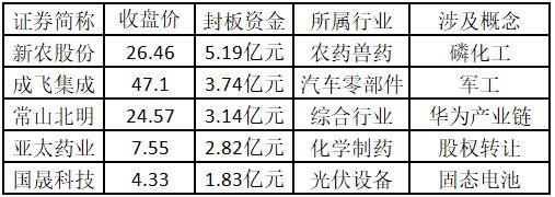 从封板资金来看,今日涨停板个股中,封板资金排名前5的个股包括新农股份、成飞集成、常山北明、亚太药业、国晟科技。