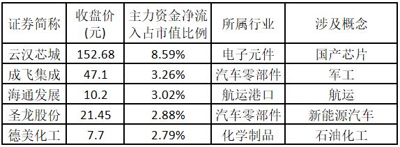 主力资金净流入金额占市值比例排名前5的个股分别为云汉芯城、成飞集成、海通发展、圣龙股份、德美化工。