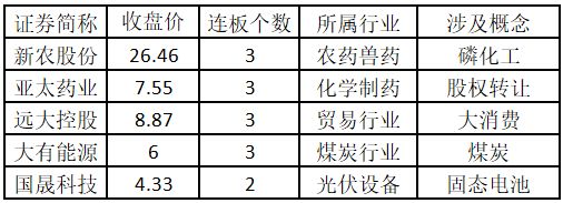 从连板情况来看,今日首板个股有28只;2连板的个股有8只;3连板及以上的个股有4只。今日连板数排名前5的个股包括新农股份、亚太药业、远大控股、大有能源、国晟科技,具体如下表所示。