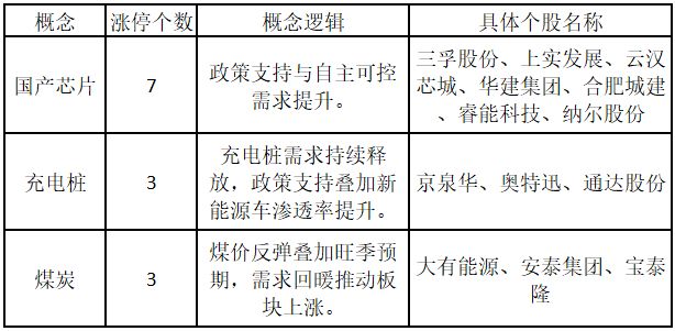 从概念特征来看,今日涨停板个股中,国产芯片、充电桩、煤炭概念的个股最多。